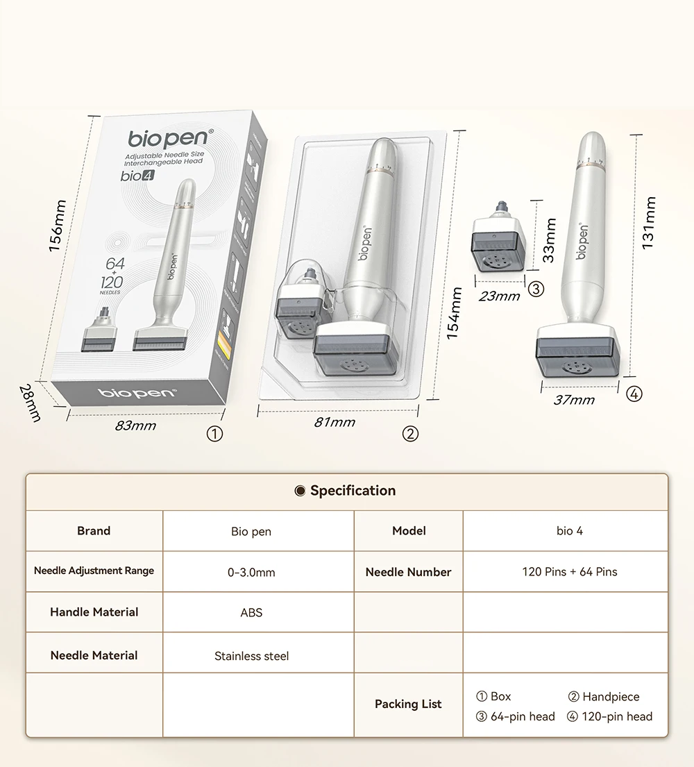 The BioPen Bio 4 dual head adjustable stamp provides you with two detachable derma stamp heads, and allows any needle depth from 0.20mm to 3.00mm by simply turning the gauge at the top.